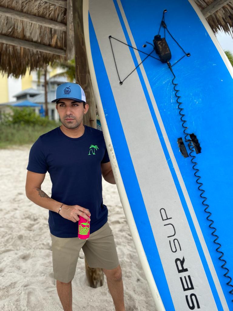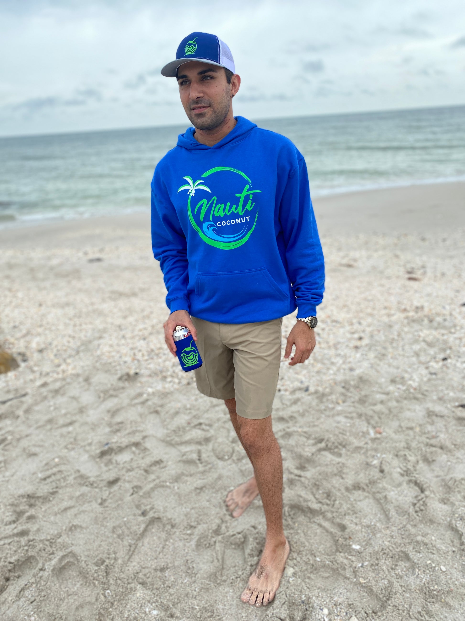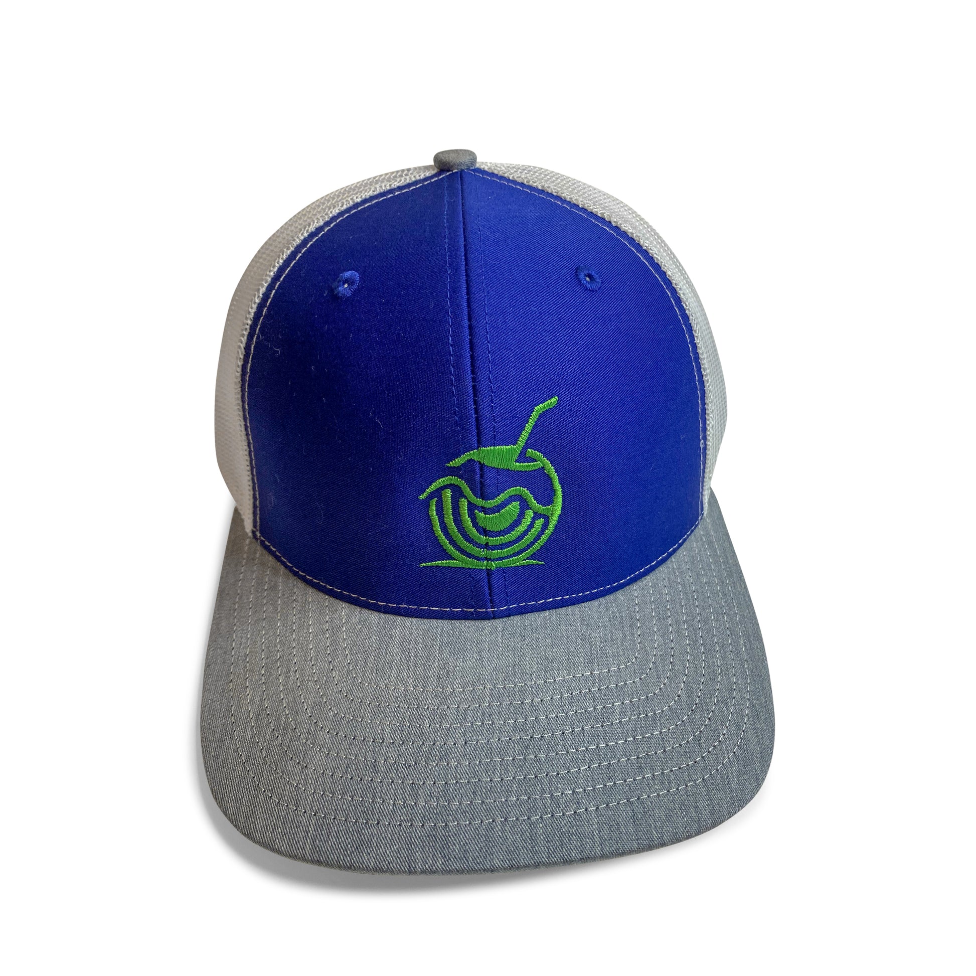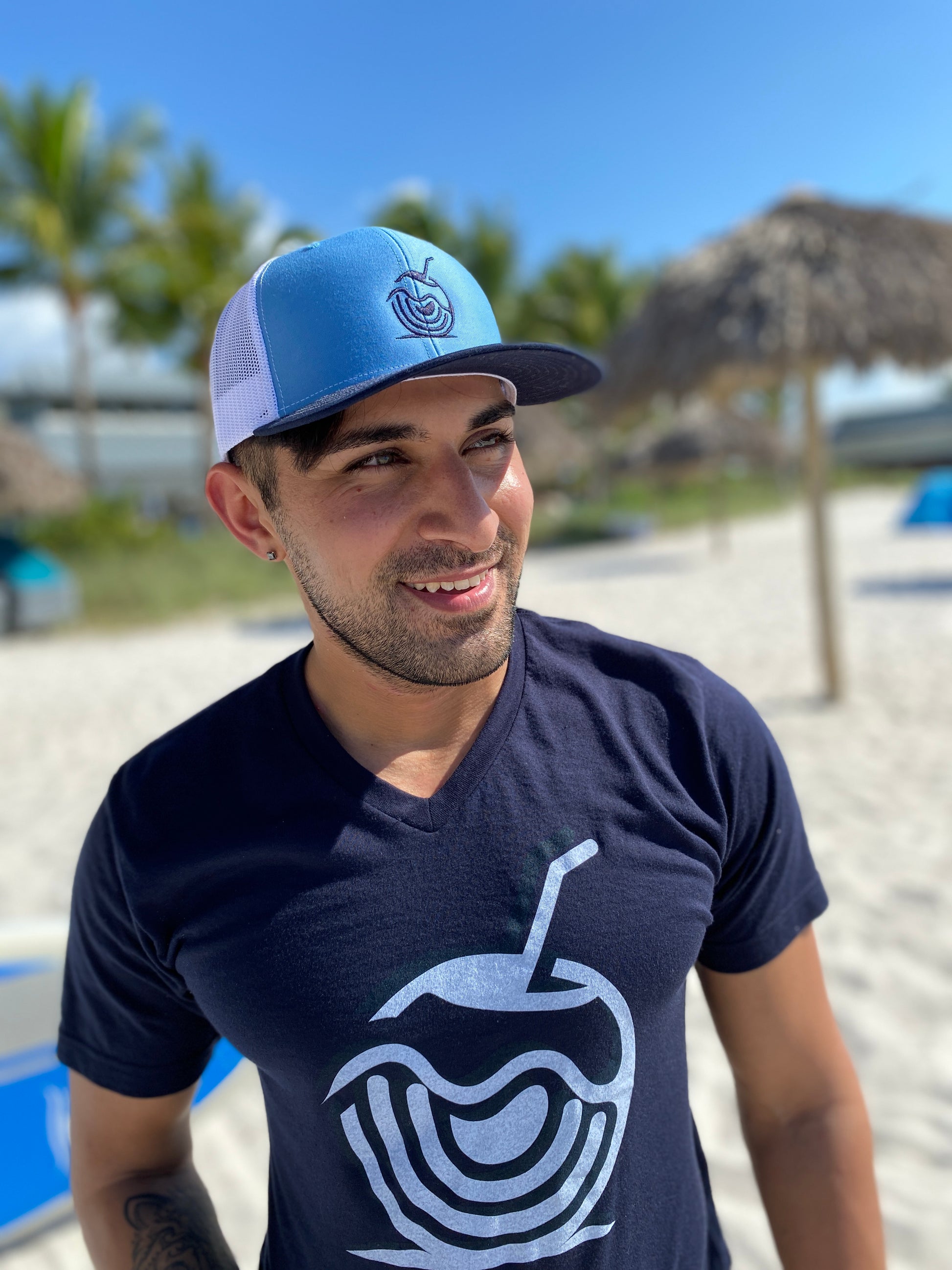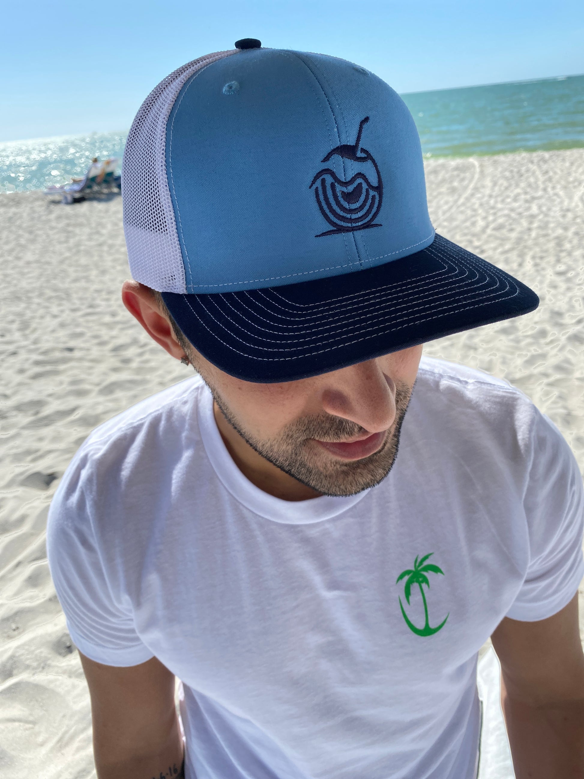 Our Coconut Vibes Snapback Trucker Cap features an embroidered Nauti Coconut logo on a cotton/polyester blend hat with a mesh back. A stylish and functional trucker hat.